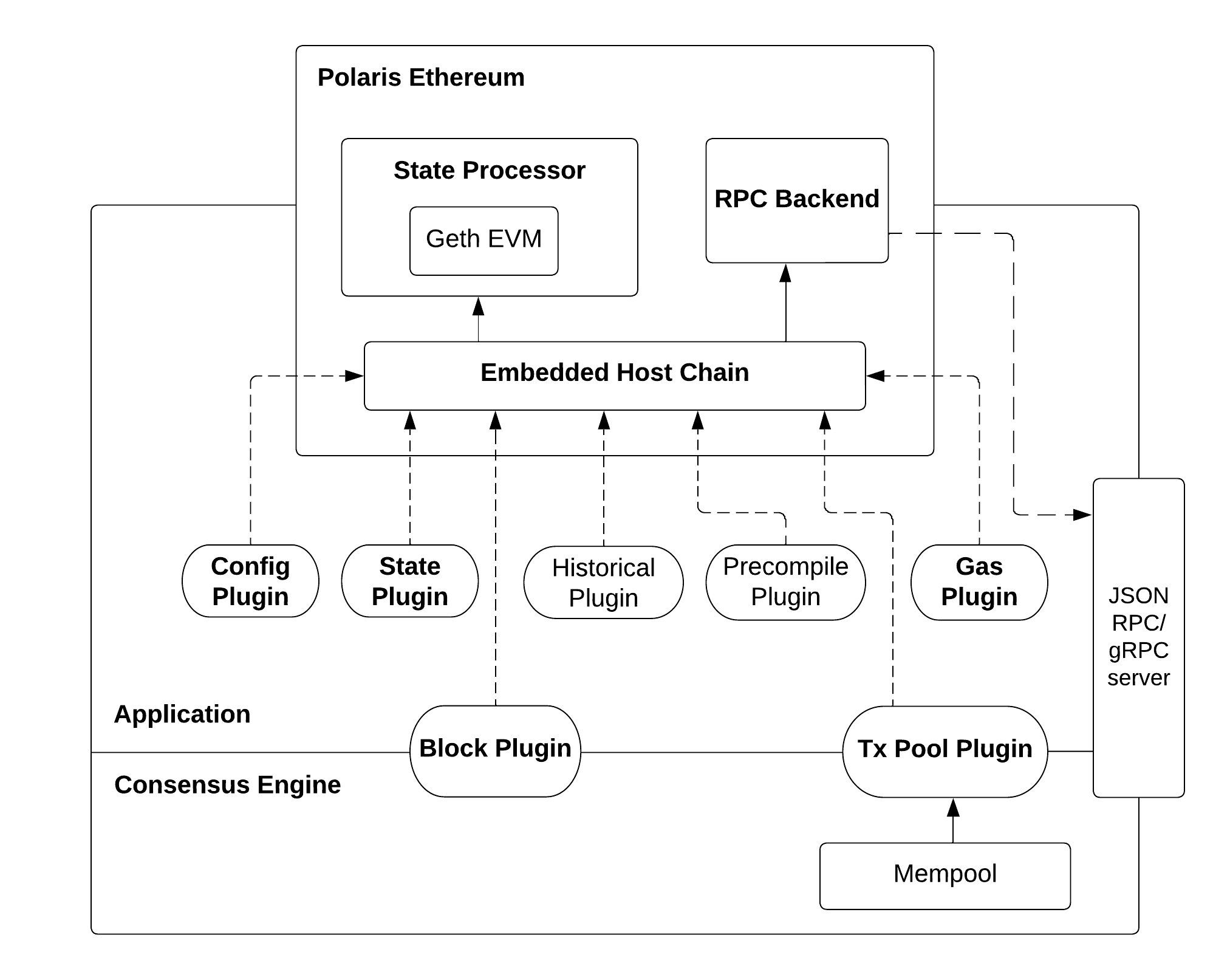 Polaris runs an Ethereum mainnet-equivalent VM on top of a L1 host chain. With a modular plugin-based architecture, Polaris enables any host chain (e.g. Cosmos SDK-based chains, Polkadot, etc.) to execute Ethereum transactions on smart contracts. The application of the host chain only needs to implement the plugins (Configuration, State, Block, Precompile, Gas, Tx Pool) so that Polaris Core can run state transitions in accordance with mainnet EVM.