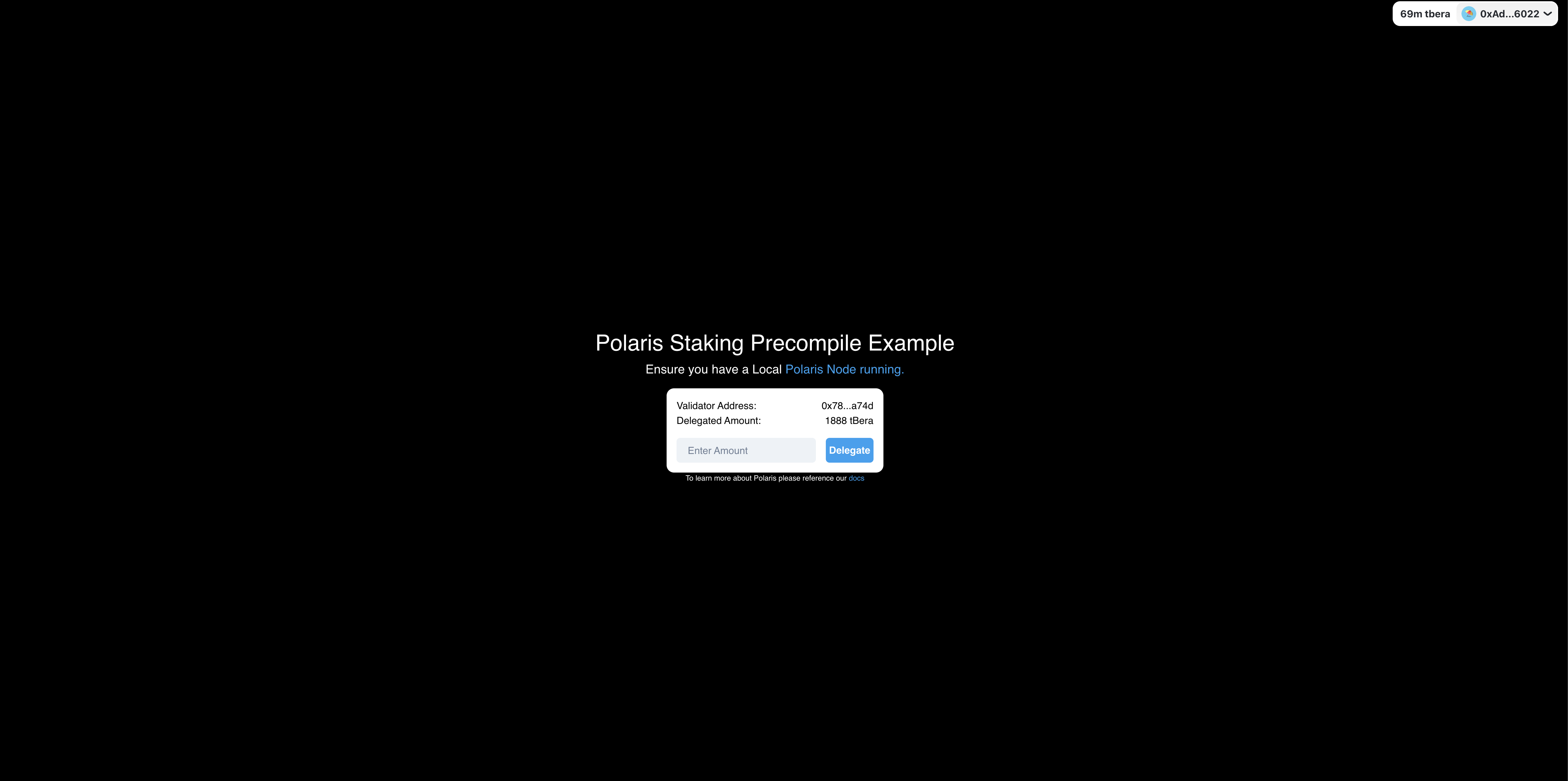 Congratulations! You have now created a staking application using the EVM! You can now delegate your tBera to a validator and earn rewards! Prior to Polaris Ethereum's precompiled contracts, the UX of this task would be more complicated and foreign as it involves many moving parts and having to use Cosmos through Metamask. Now, with the Staking precompile, we can enjoy interacting with Cosmos through an EVM native experience!